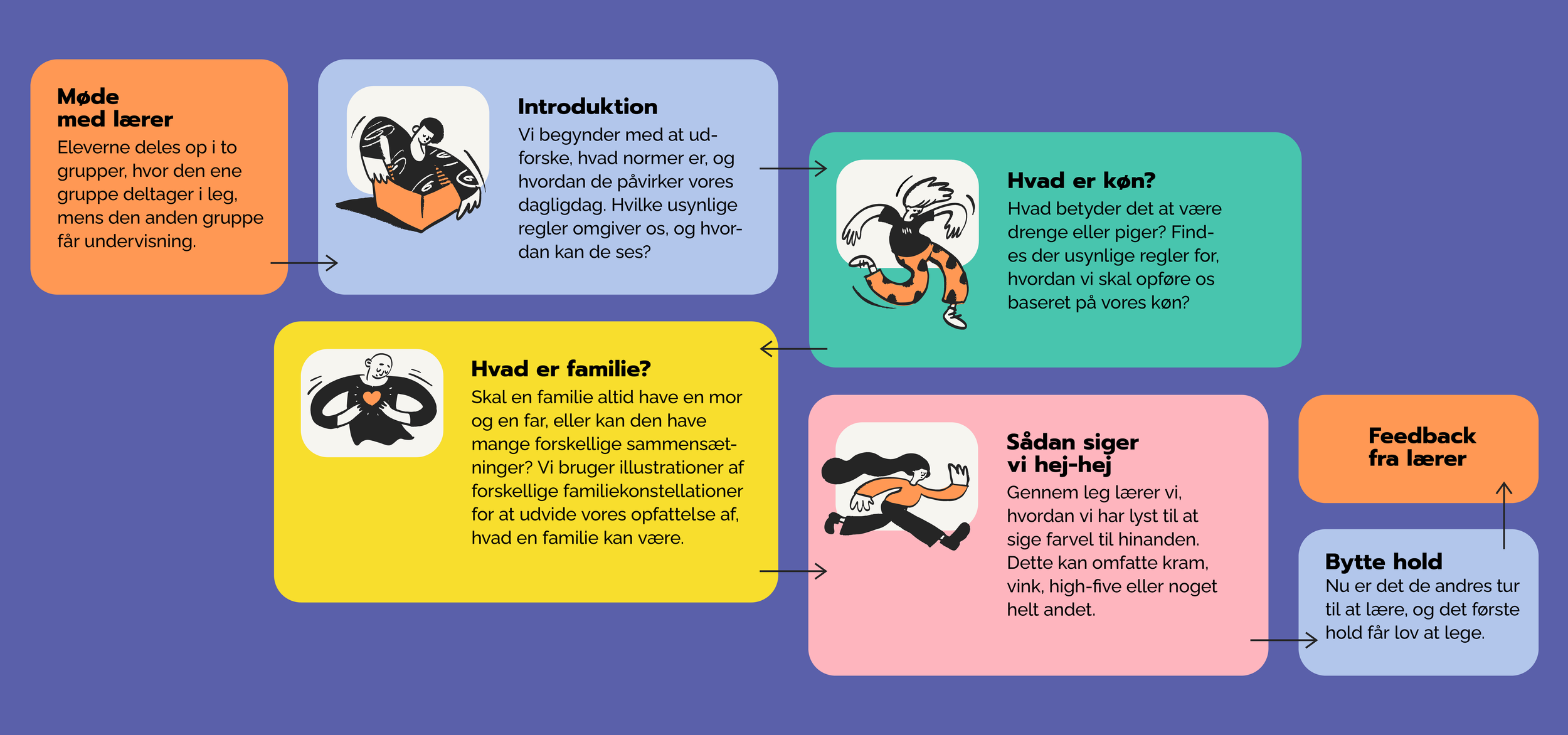 Gennem leg, læring og dialog får eleverne 1,5 times undervisning tilpasset deres klassetrin. Dette inkluderer oplæg med viden, gruppearbejde, sjove øvelser og case-eksempler.